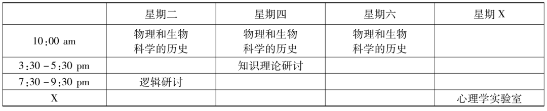 而“哲學23a2號課”的課名是“哲學方法”(philosophic method),依然是協佛開的課。它是大類課程“哲學23號課”(Philosophy 23)的分支課,“哲學23號課”之總名為“知識理論”(theory of knowledge),其目標是對與知識的方法、效度(validity)和限度(limits)有關的一些基本問題進行邏輯分析。這七門課程中,兩門科學史課程和“哲學中的實用主義運動”是通修課,余下的其他課程則全是研究生基礎課。趙元任這個學年的課程表(見表4、表5)也可以通過綜合這些課程的上課時間重新列出。