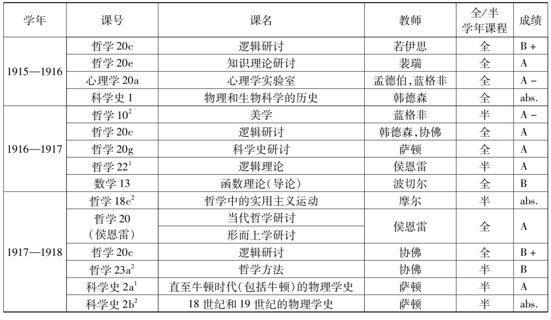 在哈佛大學學習的最后一個學年——也是受教育生涯的最后一年,趙元任修的課最多,共有六門,包括了兩門科學史課程,即“科學史2a1號課”(History of science 2a1)——名為“直至牛頓時代(包括了牛頓)的物理學史”(history of physics to [and including] Newton)的課程和“科學史2b2號課”——名為“18世紀和19世紀的物理學史”(history of physics in the eighteenth and nineteenth centuries)的課程。兩門課均由薩頓所講授,內容是物理學的進步與文明進步之間的關系,其實它們是連貫一體的,只是針對的時代有先有后而已,且一門是上學期的課,另一門是下學期的課。另外的四門課則是“哲學18c2號課”(Philosophy 18c2)、“哲學20c號課”、“哲學20號課(侯恩雷)”(Philosophy 20 [R.F.A.H])和“哲學23a2號課”(Philosophy 23a2)。其中,“哲學20號課(侯恩雷)”所表示的有可能是“哲學20a2號課”(Philosophy 20a2)或“哲學20k1號課”(Philosophy 20k1)——它們均由侯恩雷講授,但是,更可能是兩門課的結合體。因為在趙元任的哈佛成績單上,“哲學20號課(侯恩雷)”是一個全學年課程,故而并非“哲學20a2號課”或“哲學20k1號課”這樣的半學年課程;而在1917至1918學年,“哲學20號課”的分支課程中并無侯恩雷開的全學年課程——侯恩雷只在上、下學期分別有唯一的半學年課程置于“哲學20號課”名下。也就是說,趙元任這個學年實際修了七門課,即全學年課程“哲學20號課(侯恩雷)”分作了兩門半學年課程:“哲學20a2號課”——“形而上學研討”(seminary in metaphysics)和“哲學20k1號課”——“當代哲學研討”(seminary in contemporary philosophy)。前者以“理念論與新實在論的形而上學”(the metaphysics of idealism and neo-realism)為主題。后者的主題則是“邁農的《論假設》”(Meinong’s Uber Annahmen),這門課有特殊的語言要求——能讀懂德語。邁農是奧地利哲學家,以德語寫作,而趙元任早年在江南高等學堂預科便學過德語,進入康納爾大學后,德語學習亦未輟,因此,完全有能力修讀此課?!罢軐W18c2號課”的課名是“哲學中的實用主義運動”(the pragmatic movement in philosophy),內容是“實用主義運動的邏輯學、形而上學和社會方面”(logical, metaphysical and social aspects of the pragmatic movement),每周有三節課:兩個講座和一個討論會(section meeting)。這門課是由芝加哥大學的教授摩爾(Addison W. Moore)來主持的。這一學年的“邏輯研討”課程由協佛一人主持,針對特定的邏輯學主題展開,尤其是討論了那時哲學界最關注的邏輯學問題。
