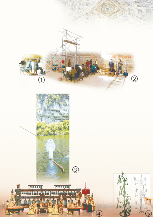 圖①圖②:敦煌研究院團隊在進行壁畫修復和洞窟數字化信息采集。 敦煌研究院供圖 圖③:楊柳獨竹漂表演。 楊 柳供圖 圖④:湖北省博物館編鐘樂團演出現場。 馬業平供圖 圖⑤:三星堆出土的青銅神樹及考古繪圖。 三星堆博物館供圖