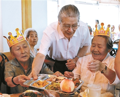 人藝《甲子園》劇組到香山老年公寓體驗生活,藍天野為壽星送飯(攝于2012年7月9日)