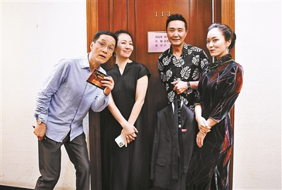 北京人藝68周年院慶劇場朗讀直播彩排后臺,馮遠征、盧芳、吳剛、張培“表演”合影