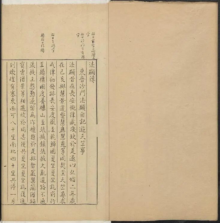 從魯迅手抄稿的天頭上的??背晒纭懊髯鳌薄胞惾毡緹o字”,可知他用來??痹镜陌姹臼恰懊鞅尽焙汀胞惾毡尽?。但其抄錄所依據的原本卻沒有說明。推測可能是較為通行的宋紹興初思溪藏本,當時京師圖書館(今國家圖書館)有藏,魯迅借閱比較方便。將之與他的抄稿核對,內容相同,只有一個差別,即京師圖書館藏本在書名“《法顯傳》一卷”下有“通字”兩字,魯迅未抄;藏本卷末附有對書中字、詞的音、義解釋,有百余個,即所謂“通字”的具體內容,魯迅也未抄錄?,F存抄稿中校文二百四十余條,主要內容是指出書中異字及抄本中多出或缺落之字?!懊鳌敝该鞔瘫?。明代以后的多種叢書收錄了《法顯傳》,如《秘冊匯函》《津逮秘書》《唐宋叢書》《增訂漢魏叢書》《學津討原》等,均名為《佛國記》。但張宗祥據明抄本輯印《說郛》卷四題為《法顯記》。魯迅所據以??闭呖赡苁敲鞔摹侗辈亍??!胞悺敝浮陡啕惒亍?。經檢核,魯迅的校對結果與高麗藏版本相同?!叭铡眲t指《卍(萬)正藏經》,全稱《大日本校訂訓點大藏經》,又稱《大日本校訂藏經》《日本藏經書院大藏經》《卍大藏經》,是日本京都藏經書院于明治三十五年至三十八年間(1902-1905),依據忍澄所校訂的黃檗本,以四號活字印行的方冊本。其經目略依《北藏》,經文多從《麗藏》,經名也以《麗藏》為主,因兩者極為相近,一般稱為“麗日本”或“日本翻刻高麗本”。魯迅在校訂《百喻經》時使用過:“乙卯七月二十日,以日本翻刻高麗寶永己丑年本校一過,異字悉出于上,多有謬誤,不可盡據也?!痹诔洝冻鋈赜浖窌r也使用過,1915年7月25日日記,晚“寫《出三藏記集》第一卷訖,據日本翻高麗本”。魯迅抄?!斗@傳》所出校文多來自麗日本,較少來自明本。
