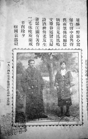 書前印有一幀男女合影,右題名曰“比翼集著者:張銘慈先生游紹斌女士合影”,左落款曰“一九二四年雪冬后攝于北京中央公園”。一目了然,既曰“比翼”,即此二人(或夫婦或情侶)之詩作合集;卷上所輯為游紹斌女士詩作;卷下所輯為張銘慈先生詩作。毋庸多言,此乃一冊不多見的“情侶詩集”。