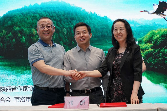 授牌儀式上,鄧凱、齊雅麗代表中國作協和陜西作協與商洛市簽訂“新時代文學實踐點”三方合作協議。鄧凱和賈平凹分別向商洛市頒授了中國作家和陜西作家“深入生活 扎根人民”新時代文學實踐點牌匾。