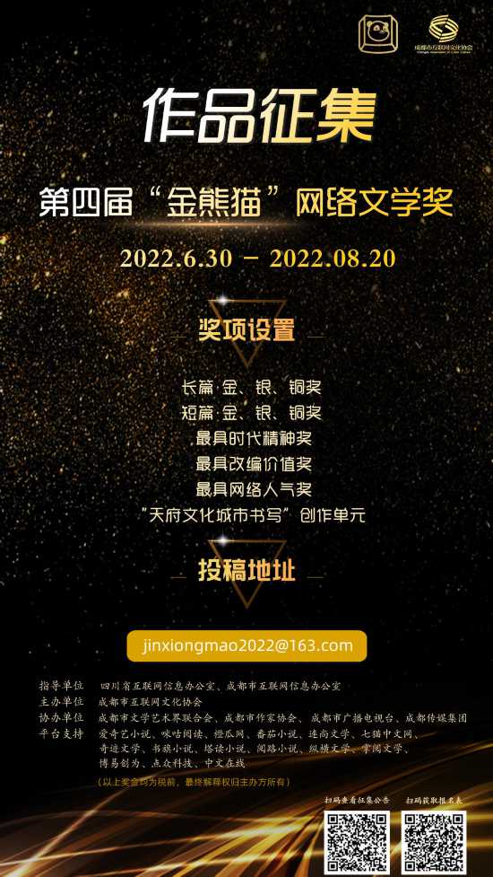 2、平臺推薦稿件請下載填寫《第四屆“金熊貓”網絡文學獎平臺作品參評說明》并加蓋公章,填報作品信息表并附上作品電子版內容,發送至電子郵箱“jinxiongmao2022@163.com ”郵件標題請注明【平臺名稱+作品推薦名稱】。關注“成都市互聯網文化協會”公眾號后回復“報名表”即可獲取。
