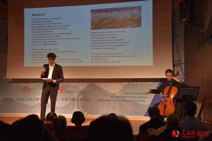 法國青年演員凡維登在悠揚的琴聲中朗誦中文詩歌的法語翻譯版 轉自人民網 記者劉玲玲 攝