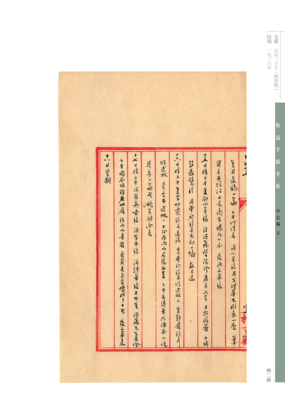 與20世紀文物出版社出版的《魯迅手稿全集》相比,這一版手稿全集的文稿、日記、書信編增加體量不大,文稿編增加了“詩稿”部分;書信編除增加部分書信外,還增加了近600件信封及其他附件。譯稿編是文物出版社的《魯迅手稿全集》曾計劃出版而未能施行的,幾十年來,魯迅譯稿的收藏單位有零星整理出版,如北京魯迅博物館的《魯迅譯〈死魂靈〉手稿》,上海魯迅紀念館的《魯迅譯〈毀滅〉手稿》等,但此次第一次以全編的名義出版,其中包括從未面世過的《文學者的一生》等 11 種譯稿。此外,金石編也有較大幅度增加。