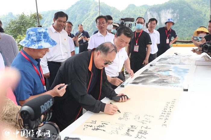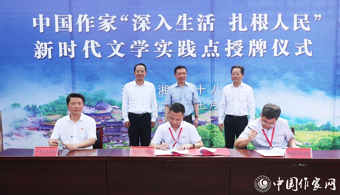 中國作協主席團委員、書記處書記邱華棟為中國作家“深入生活、扎根人民”新時代文學實踐點授牌,湘西州州委書記虢正貴接牌