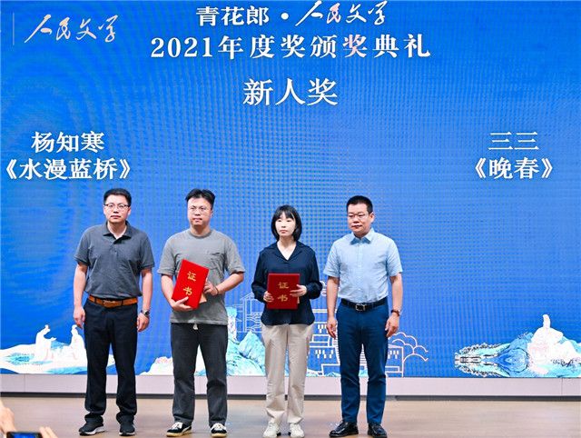 作為近年來引人注目的青年作家,楊知寒在《水漫藍橋》等短篇小說創作中逐漸走出了自身的圈層所限,使自己正在經歷和經歷過的生活,不再是寫作的唯一素材來源,而是放飛想象力、擴展生活邊界、打開廣闊創作視野、在有限篇幅里編織一個個可以供人遐想的氛圍,不斷發現自我,也發現他人,隔空取暖,打造信任,積累更多人格力量,給受眾帶來閱讀的自由與快樂。有鑒于此,特授予楊知寒2021年度青花郎?人民文學獎新人獎。
