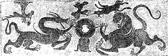1973年四川郫縣新勝鄉出土石棺棺蓋,上圖為青龍、白虎捧璧,下圖為牛郎織女局部