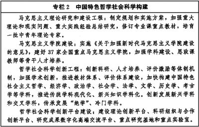 把習近平新時代中國特色社會主義思想貫穿哲學社會科學各領域各學科,加快構建中國特色哲學社會科學,推進學科體系、學術體系、話語體系建設和創新。加強頂層設計和統籌協調,制定中長期發展規劃。加強學科基礎理論建設,打造具有中國特色的理論學派。深化當代中國馬克思主義政治經濟學研究。堅持問題導向,圍繞事關黨和國家事業發展全局的戰略問題,推出一批扎根中國大地、聚焦偉大實踐、反映時代特征的原創性、標志性科研成果,推動重大學術成果國際化傳播。培育高效整合國內外學術資源、引領學科創新發展的學術平臺。充分發揮國家社會科學基金示范引導作用。深入推進中國特色新型智庫建設。(見專欄2)(見專欄3)