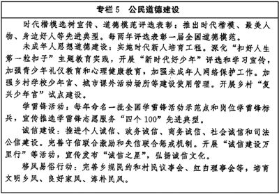 傳承弘揚中華傳統美德,加強社會公德、職業道德、家庭美德、個人品德建設,加強家庭、家教、家風建設。加強對革命、建設、改革時期各類先進典型的學習宣傳,尊崇褒揚英雄模范,關心關愛先進典型人物。健全家庭、學校、政府、社會相結合的思想道德教育體系,把立德樹人貫穿學校教育全過程。發揮優秀文化產品陶冶道德情操的作用,完善市民公約、鄉規民約、學生守則、團體章程等社會規范,廣泛開展弘揚時代新風行動,深化道德領域突出問題治理。加強農村思想道德建設,創新文化科技衛生“三下鄉”長效機制。(見專欄5)