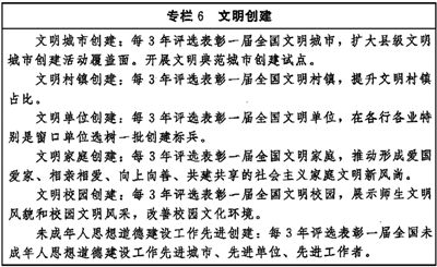 以實施文明創建工程為抓手,推動文明培育、文明實踐、文明創建不斷深入。創造性開展文明城市、文明村鎮、文明單位、文明家庭、文明校園和未成年人思想道德建設工作先進等精神文明創建活動,拓展新時代文明實踐中心建設。弘揚科學精神,深入開展愛國衛生運動,深化文明餐桌行動和“光盤行動”,倡導文明健康、綠色環保的生活方式。健全志愿服務體系,廣泛開展志愿服務關愛行動。加強網絡文明建設。(見專欄6)(見專欄7)