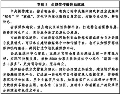 加快推進媒體深度融合發展,有效整合各種媒介資源、生產要素,推動在信息內容、技術應用、平臺終端、管理手段等方面共融互通,打造一批具有強大影響力、競爭力的新型主流媒體。統籌處理好傳統媒體和新興媒體、中央媒體和地方媒體、主流媒體和商業平臺、大眾化媒體和專業性媒體的關系,建立以內容建設為根本、先進技術為支撐、創新管理為保障的全媒體傳播體系。推進內容生產供給側結構性改革,完善高質量內容產出機制,推廣互動式、服務式、場景式傳播。強化新一代信息技術支撐引領作用,支持主流媒體重塑采編流程、建設平臺終端、優化管理手段、強化版權保護、打造媒體資源數據庫、提升內容生產力、占據傳播制高點。創新媒體業態、傳播方式和運營模式,強化用戶連接,發揮制度優勢和市場作用,增強主流媒體競爭力。(見專欄8)