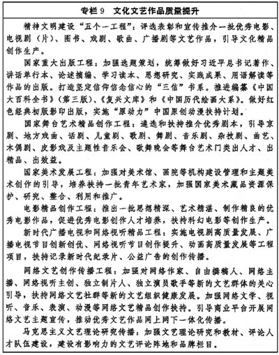 鼓勵文化單位和廣大網民依托網絡平臺依法進行文化創作表達,推出更多優秀的網絡文學、綜藝、影視、動漫、音樂、體育、游戲產品和數字出版產品、服務,推出更多高品質的短視頻、網絡劇、網絡紀錄片等網絡視聽節目,發展積極健康的網絡文化。實施網絡精品出版、網絡音樂產業扶持計劃。加強各類網絡文化創作生產平臺建設,鼓勵對網絡原創作品進行多層次開發,引導和規范網絡直播等健康發展。加強和創新網絡文藝評論,推動文藝評獎向網絡文藝創作延伸。(見專欄9)
