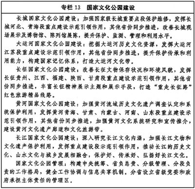 整合長城、大運河、長征、黃河、長江沿線等重要文化資源,強化文物和非遺真實完整保護傳承,重點建設管控保護、主題展示、文旅融合、傳統利用等主體功能區,系統推進保護傳承、研究發掘、環境配套、文旅融合、數字再現等重點基礎工程,實施公園化管理運營,形成具有特定開放空間的公共文化載體,集中打造中華文化重要標志。(見專欄13)