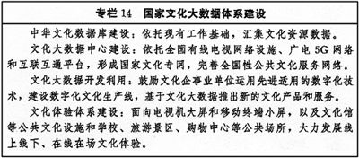 加強規劃引導和政策指導,打通各層級公共文化數字平臺,打造公共文化數字資源庫群,建設國家文化大數據體系。統籌推進公共文化數字化重點工程建設,把服務城鄉基層特別是農村作為著力點,不斷縮小城鄉之間的數字鴻溝。建設智慧圖書館體系和國家公共文化云,建設智慧博物館,打造智慧廣電、電影數字節目管理等信息數字化服務平臺。積極發展云展覽、云閱讀、云視聽、云體驗,促進供需在“云端”、“指尖”對接。推進農家書屋數字化建設,建立智能化管理體系。(見專欄14)