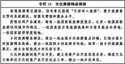適應大眾旅游時代新要求,推進旅游為民,推動構建類型多樣、分布均衡、特色鮮明、品質優良的旅游供給體系,推動文化和旅游業態融合、產品融合、市場融合。提升旅游演藝、文化遺產旅游、文化主題酒店、特色節慶展會等品質,支持建設集文化創意、旅游休閑等于一體的文化和旅游綜合體。依托革命博物館、黨史館、紀念館、革命遺址遺存遺跡等,打造紅色旅游經典景區和經典線路。利用鄉村文化傳統和資源,發展鄉村旅游。加強對當代社會主義建設成就的旅游開發,深入挖掘重大工程項目的精神內涵,發展特色旅游。加強對工業遺產資源的活化利用,開發旅游用品、特色旅游商品,培育旅游裝備制造業,發展工業旅游。推動旅游與現代生產生活有機結合,加快發展度假休閑旅游、康養旅游、研學實踐活動等,打造一批國家全域旅游示范區、A級旅游景區、國家級旅游度假區、國家精品旅游帶、國家旅游風景道、特色旅游目的地、特色旅游功能區、城市綠道、騎行公園和慢行系統。大力發展智慧旅游,推進智慧景區、度假區建設。