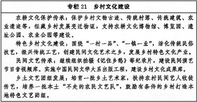 充分發揮文化傳承功能,全面推進鄉村文化振興,推動鄉村成為文明和諧、物心俱豐、美麗宜居的空間。加強農耕文化保護傳承,支持建設村史館,修編村史、村志,開展村情教育。把鄉土特色文化融入鄉村建設,留住鄉情鄉愁。創新支持和激勵方式,將優秀文化資源轉化為鄉村永續發展的優質資產,推動鄉村文化建設與經濟社會發展良性互促。探索以志愿服務等方式,發展民間優秀文化機構、文藝團體。鼓勵鄉村自辦文化,支持農民辦自己的文化藝術節、詩歌故事會、劇團演出、書畫攝影創作展等。增加鄉村優秀文化產品與服務供給,推進文化結對幫扶,鼓勵“三農”題材文藝創作生產,扶持具有鄉土特色的文藝創作。開展“互聯網+中華文明”行動計劃,推進數字文化資源進鄉村。探索建立鄉村文化交流交易平臺,活躍鄉村文化市場。(見專欄21)
