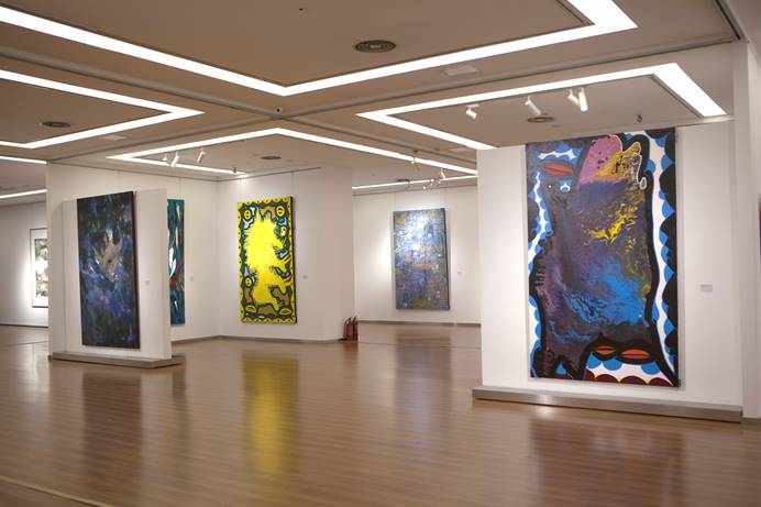 8月20日,“秘境·薩拉烏蘇——賀鵬飛繪畫作品展”和“墨趣·抽象與具象之碰撞——賀鵬飛師友合作展”在北京炎黃藝術館同時開幕?!懊鼐场に_拉烏蘇——賀鵬飛繪畫作品展”展出原始主義畫派抽象表現主義畫家、出版人、連鎖書店“字里行間”品牌創始人賀鵬飛近年來創作的個人繪畫作品40余幅,靈感主要來源于內蒙古鄂爾多斯薩拉烏蘇文化遺址?!澳ぁこ橄笈c具象之碰撞——賀鵬飛師友合作展”展出賀鵬飛與蔡志忠、韓紹先、張志民、薛云祥、梁曉聲等一眾師友碰撞、合作創作的繪畫作品60余幅。