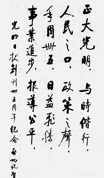 1994年,啟功先生作詩并寫書法慶賀光明日報創刊45周年:“正大光明,與時偕行。人民之口,政策之聲。年周卌五,日益飛騰。事業進步,報道公平?!?/span>