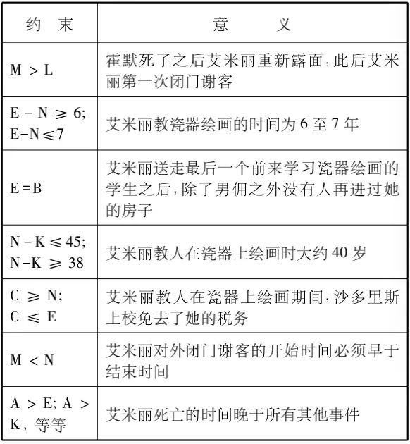 在此基礎上,她們決定采用約束編程方法給《玫瑰》編輯一個程序?!睹倒濉分械氖录蠖嘀挥幸恍┠:南鄬r間信息,新的電腦程序通過對這些信息加以整理,給所有變量附加一些約束,將最大限度地整理出不同變量之間的準確時間關系。例如,由于艾米麗獲得稅務豁免的時間是1894年,所以可以用C=1894來表示,同樣,由于艾米麗死前的10年當中除了黑人男傭之外誰也沒有進過她家的房子,所以可以用A-B≥10來表示。通過這樣的等式和不等式,我們就可以得出一個新的表格: