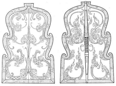 《周禮·夏官》說周到有“五兵五盾”,具體是哪五種盾則不太清楚。除了車盾、步盾外,應該還有一種專門用來樂舞的舞盾。兩周之際出現了一種新的盾牌形制,兩側呈弧形,更加貼近人體生理特征,也就是戰國秦漢最為流行的“雙弧盾”?!半p弧盾”不少繪制有精美的漆繪,如湖南長沙五里牌戰國楚墓中,就出土了兩面非常精美的皮制漆盾,表面用赭石和藤黃雙色繪制出龍鳳花紋。這些盾牌都不會是作戰使用,而只在貴族宴會上供舞者使用。