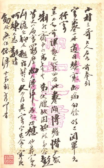 陶氏于光緒五年(1879)四月任湖南學政,其使用的“守如上言”花箋,應是當地文友陳守愚所贈。光緒六年(1880)六月,他因母喪守制卸任返鄉。札中有“弟伏臘故園極所系念。彭芍丈以局事羈縻,尚不得歸,為之心惄?!痹圃?,意思是他很想回鄉,但湖南巡撫彭祖賢以“局事”(修通志局之事)相“羈縻,尚不得歸”。因此,這封信札是陶方琦在光緒六年六月卸任之前所寫,據札中“適因嬰寒,臥病旬余”“寒夜呵凍”等語,知此札系年當為光緒五年末到六年初之間。