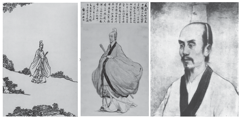 左:陳洪綬《屈子行吟圖》中的屈原形象;中:蔣兆和繪制、郭沫若題詞的《屈原像圖軸》,此為文聯紀念會場懸掛的《屈原像》;右:世界四大文化名人紀念大會會場懸掛的《屈原像》