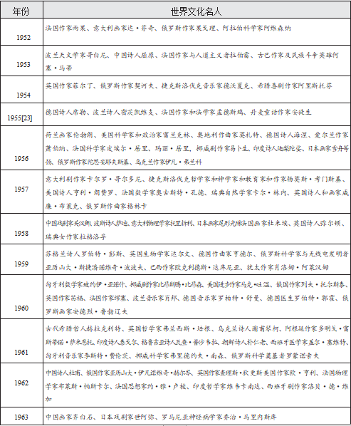[23]1955 年的世界文化名人紀念還包括印度阿旃陀壁畫一千五百周年紀念,《堂·吉訶德》出版三百五十周年紀念與《草葉集》出版一百周年紀念。