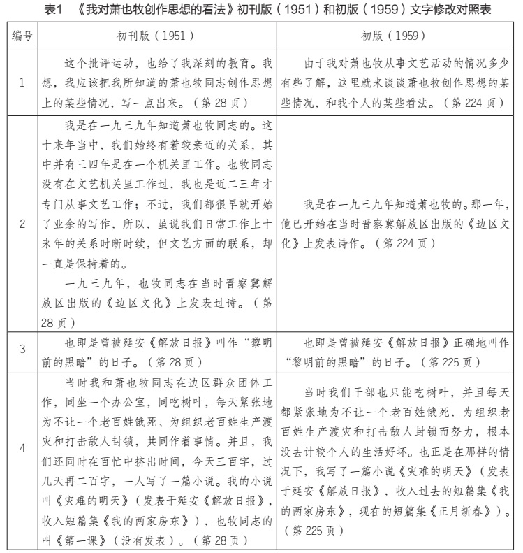 《我對蕭也牧創作思想的看法》1951年初刊本和1959年初版本涉及的版本變遷及其差異,明顯地體現出特定時代的政治壓力之下,作家不得不刻意進行的修改行為:不管是康濯對1950年代文藝界大右派分子丁玲相關文字的“刻意回避”,還是在文本細節中對蕭也牧的稱謂修改(從“蕭也牧同志”或“也牧同志”到“蕭也牧”的處理),還是在文本措辭的仔細修訂與刪改(本文統稱為“修改行為”)上。