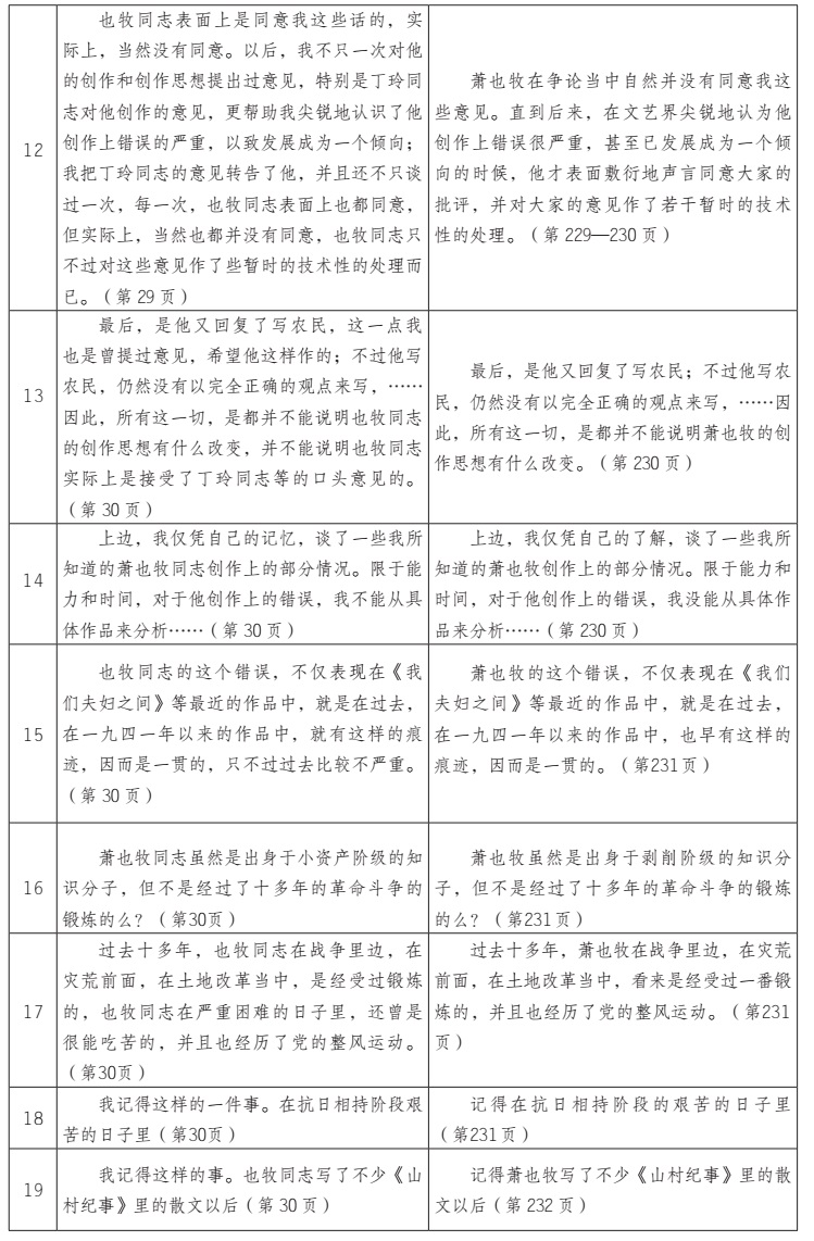 編號12的修改,可以與編號9、10、11和13結合起來進行分析。有關丁玲的敘述文字,正如前文所指出的,因丁玲的政治身份在1955年丁玲陳企霞“反黨集團”和1957年丁玲馮雪峰“反黨集團”中被定性,康濯回避了與丁玲相聯系的文字交集,這是出于政治立場的考量。但是,康濯1951年初刊的敘述中,他與蕭也牧是沒有爭論的,到1959年初版時,他加強了對爭論的“色彩”。而在沒有“爭論”的前提下,他們的文學觀點有某種“相似性”,因而在實際的文學經驗交流中,康濯對蕭也牧的文學觀點有所認同,“在也牧同志向我提意見時,我已開始感覺到一些,因此,對于他前半部意見,我是同意的,并且已在苦惱當中尋求進步”,但1959年初版時,康濯堅持以論爭為前提,否定了蕭也牧對他文學創作意見的意義,從而遮蔽了真實的情況。這種有意遮蔽蕭也牧文學創作觀的意圖,顯然是為了堅持對蕭也牧的正確批判。另外,值得注意的是,1951年初刊時,康濯透露出自己寫作這篇文章,是在丁玲的啟發之下進行的,但1959年初版時,他把文章寫作意圖進行了完全的遮蔽,徹底與丁玲劃清了界限。