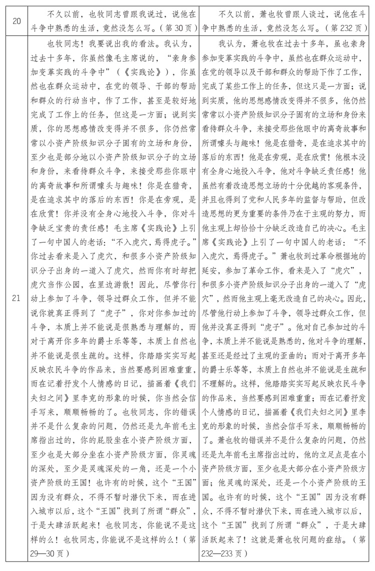 編號16的修改,直接改變了批評蕭也牧的“性質”。1951年初刊時,康濯認定蕭也牧是“小資產階級的知識分子”,1959年初版時他把蕭也牧定位為“剝削階級的知識分子”。小資產階級的知識分子的改造是可能的,但剝削階級的知識分子的改造,則顯示出更加的嚴峻性和艱巨性。稱其為剝削階級知識分子意味著蕭也牧是難以改造的知識分子,骨子里一貫帶有反動的思想。這一修改的背后,使蕭也牧成為真正的政治敵人。1957年反右運動之后,蕭也牧的確被定性為反黨反社會主義的階級敵人,康濯的這種政治性質的修改,切合了1957年之后的中國政治環境對右派分子的分類屬性。這樣的條件下來理解編號17對蕭也牧行為的修改,當然是可以理解的。作為剝削階級的知識分子,蕭也牧不可避免地讓人想起剝削階級的某些階級特征,剝削階級的本性決定了他沒有吃苦耐勞的優秀品質,所以康濯進行了文字的刪改,把“也牧同志在嚴重困難的日子里,還曾是很能吃苦的”這樣的文字進行了清除。