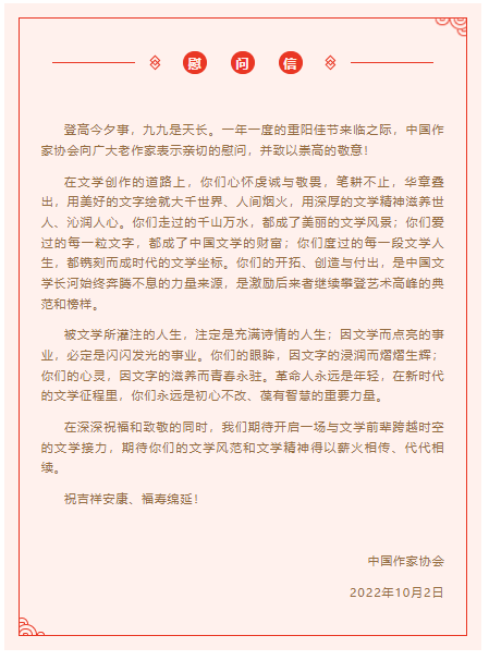 為進一步弘揚中華民族孝親敬老傳統美德,關愛和致敬德高望重的前輩作家,營造敬老尊賢的良好風氣和文學薪火代代相傳的良好氛圍,在一年一度的重陽佳節來臨之際,中國作家協會向全國廣大老作家發出重陽慰問信,并以委托團體會員單位走訪、致電等多種形式,集體慰問95歲以上的中國作協會員,向他們致以真誠的節日問候和崇高的敬意。中國作協黨組書記處同志陸續走訪慰問部分在京高齡作家。