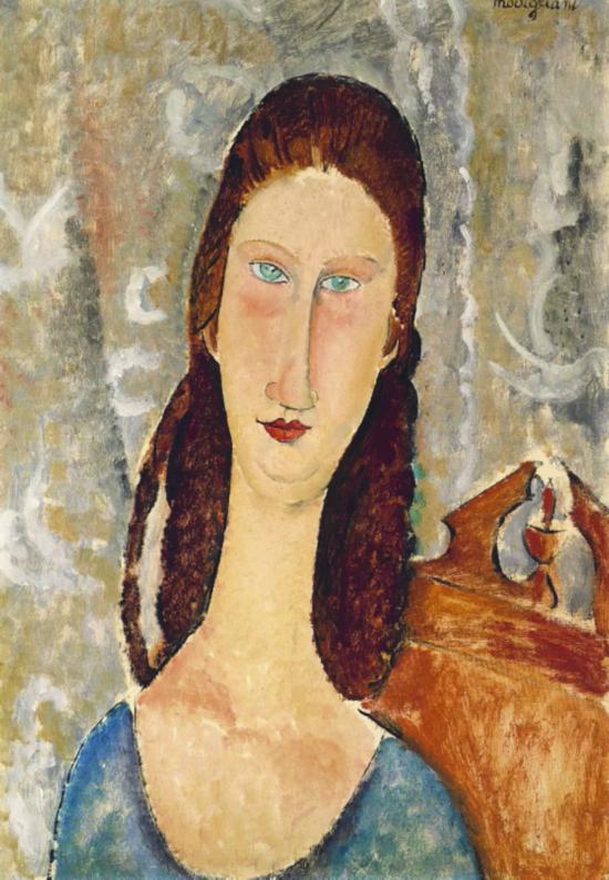 讓娜·艾布泰勒納1898年生于法國塞納-馬恩省的莫市,哥哥安德烈是個風景畫家。在兄長關懷下,她青年時期進入位于巴黎蒙巴納斯大茅廬街的科拉羅西美術學院習畫,兼給日本雕塑家福吉塔當模特兒,人們稱她為“椰子”。因為她冰肌雪膚,一頭褐色秀發結成長辮,身段苗條,婀娜生姿。據傳,意大利血統的畫家莫迪格里阿尼在大路上偶遇“妙曼如驚鴻,飄逸如神女”的讓娜,好像當年但丁看見貝雅特里絲,彗星復現一般,立時屬意于這位杏眼女郎。1917年3月,經由烏克蘭雕刻家夏納·奧爾洛夫介紹,二人在“赫桐德大酒店”邂逅,際會如期,雙方一見鐘情。另有一說是,莫迪為女方的容貌所迷,覺得自己遇見了終生紅顏知己。他在一個假面舞會上,戴著“彼埃羅”面具向讓娜獻殷勤。其時,讓娜尚未成年,但情竇初開,毫不遲疑地投入了莫迪的懷抱,跟他到大茅廬街八號陋舍同居。