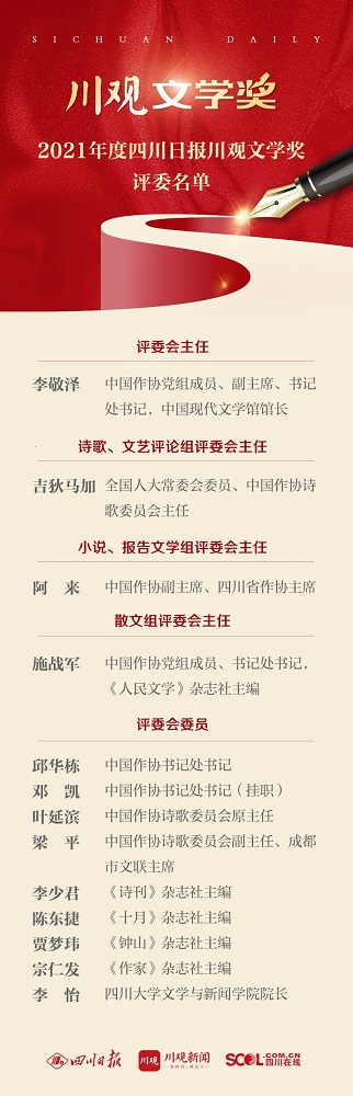 據了解,四川日報川觀文學獎將每年評選一次。2021年度四川日報川觀文學獎評獎結果,組委會將按評獎辦法完成相關程序后進行公示和公布。隨后將舉行頒獎典禮。