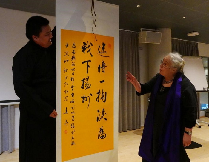 國際說書曲藝協會德國負責人劉輝向易德波轉贈了中國曲協主席姜昆的書法賀幅作品,并宣讀了中國曲協的賀辭。