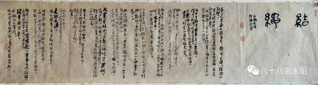 這是我平生真正事筆墨以來,第二次抄讀如此長的文字。第一次是2015年,抄讀之道在印度尼西亞寫的長詩《咖啡園》,那次用了一個禮拜的時間,共抄寫了四大本冊頁。這次抄寫《結繩》,我用了三天時間,在34/136厘米一張的毛邊紙上共寫了11張,這11張橫向豎排下來,就像一個層層排列的墨繩矩陣?!督Y繩》長征寫了119首,他有意沒寫足120首湊一個偶數整數,而是用一個奇數了結,肯定也有他的深意。我這同樣也為奇數的11張,正好暗合了長征的意圖。抄寫完成后,除了起首和落款,我本不想再在其它頁面上使用印章。我私下忖度,如此長詩構成的繩陣,那行間的崎嶇錯落,墨跡的枯潤干濕,單字的大小繁簡,分布的疏密留白,完全沒必再要用印章來調整。但我還是在每一張上或多或少地蓋了一些。這些印章留下的鮮紅印痕,在黑色的墨跡之中分外奪目。我希望它們即是太陽,也是月亮和星星,照耀著古人,也照耀著今人;照耀著開天辟地的曠世文明,也照耀著紛繁蕪雜的現代生活。同時,我還希望其中最不顯眼的一枚就是我,堅定地站在墨河的此岸,也站在彼岸,聽時光之筆揮灑出的風霜雨露,波濤雷霆。而我,見證了這一切,就像見證了自己的人生。我素來崇尚謙和虛沖、沉靜練達、余音繞梁的文字,喜愛蘊藉含蓄、用筆如刀、紙墨相生的書法,這次抄讀長征《結繩》,我卻忍不住昂揚激奮起來,書幾如野狐禪,文亦詞不逮理,顛三倒四,差點兒滿嘴里和滿紙上都跑了火車。