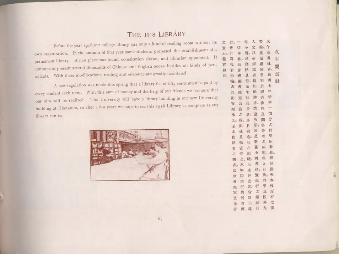 值得一提的是,部分年刊中對校史的記載,有助于我們從歷時性的視角了解學校在添設課程、更換教授、增新建筑物等各方面的發展變化。以圖書建設為例,1919年《復旦年刊》中有瞿宣穎所撰《戊午閱書社》“戊午閱書社者,民國七年秋季一部分之同學所發起,將以擴充本校原有之圖書館,并促起同學對于圖書檢閱及圖書管理之興趣?!薄氨灸陮弥魅螢楹屋崛?,會計為程學愉,書記則宣穎承乏。至本校原有之圖書,則耿君佐軍保管之責云?!笔菫閺偷﹫D書館之最早雛形。又1925年《復旦年鑒》載文《復旦大學圖書館簡史》稱“一年以來,凡書籍分類、編號將次就緒,全館圖書增至五千九百八十六冊。本學年又添購六百余冊,又承劉大白先生寄存二千余冊,杜定友先生寄存八百余冊,合計存書將近萬卷,較二年前幾增一倍?!笨芍?925年全校藏書規模已將近萬冊。至1935年時任圖書館主任吳耀中撰文《本校圖書館概況》云“二十一年滬戰之際,本館幸得保存,惟重加整頓,費時甚久,前各系圖書室現均改稱研究室,年來努力充實內容,書籍猛增,是為本館發展程上之突飛猛進時期”(見1935年《三十年的復旦》),吳氏文末特附圖表加以說明,其中《歷年藏書統計表》所列為1926年至1935年藏書中日文、西文及總計數量,1926年總計11182冊,1935年總計為34260冊。年刊所記呈現了復旦圖書館在初創階段從無到有、篳路藍縷的發展過程。