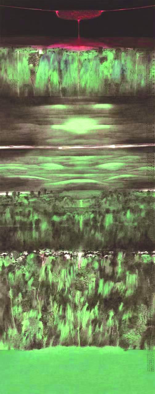 隨著時代的變化,生活空間在擴展,表現領域也在拓寬,如何以更具創造性的筆墨語言傳遞創作者的所思所感所想?就我個人的經歷感受來說,我生活的那樣一個特殊的地理、地域、環境,基于對東北大地自然物象的觀察、對家鄉的深厚情感,以及對傳統山水畫的深入研究,我開始嘗試超越對具體自然景象的描摹,以線的勾勒和大面積的皴擦、渲染,構成新的語言符號和圖式,創作出“靜觀作八荒”系列山水畫。這些作品旨在通過富有象征意義的宏觀景象,彰顯崇高、神圣、寧靜的東方意境。此后,我也不斷從傳統與自然之中汲取創作養分,也在這本大書中去尋找靈感,陸續創作了“唐人詩意”“山海經”等系列作品,借助古代詩文當中的浪漫想象,營造理想山水家園,詮釋對于宇宙天地的宏觀思考和對于詩意棲居的微觀洞察。