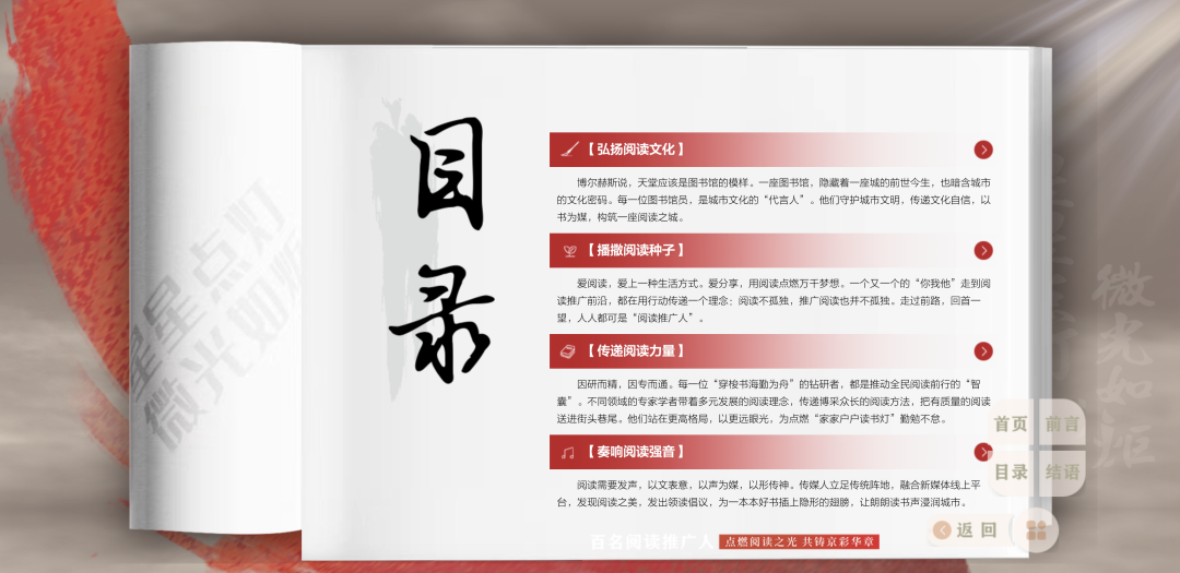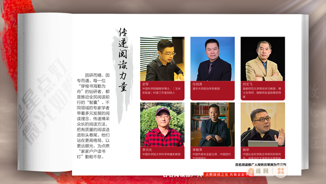 作為北京市公共圖書館的中心館和龍頭館,首都圖書館攜手全市公共圖書館打造本展覽,設置“弘揚閱讀文化”“播撒閱讀種子”“傳遞閱讀力量”“奏響閱讀強音”四大版塊,通過視頻講述、文字概述、照片展示,全要素呈現了來自圖書館員、民間閱讀推廣人、專家學者、媒體人等各行各業的100位優秀閱讀推廣人的精彩故事。展現北京全民閱讀事業的鮮活成就,及對京津冀公共文化協同發展乃至全國范圍閱讀推廣的輻射力。