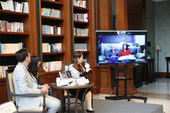 視頻畫面中左側為作家米歇爾·維勒貝克,右側為李倩云