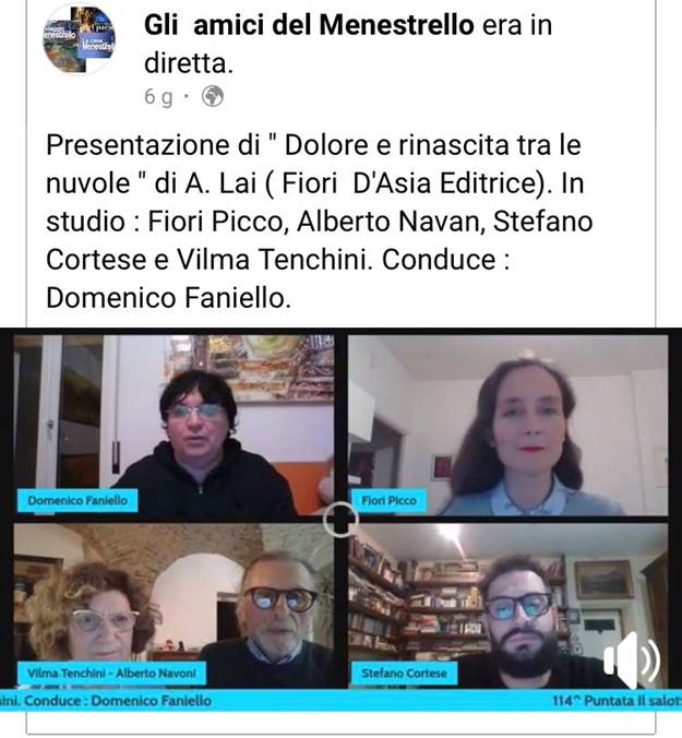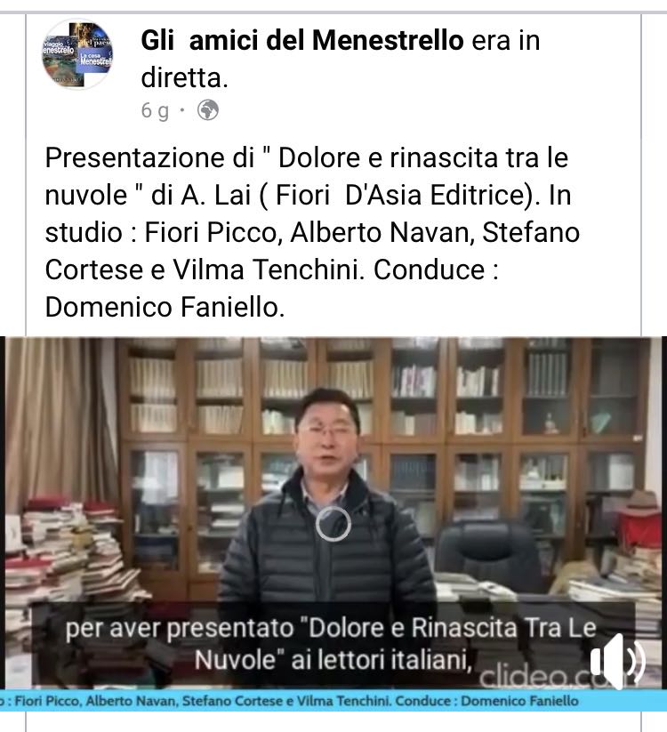 12月19日,意大利 “中國文學讀者俱樂部” 開展第二場線上讀書活動,推介了作家阿來的意大利文版長篇小說《云中的痛苦與重生》(中文版書名為:《云中記》)。此次俱樂部活動由意大利花達西亞出版社 (Fiori d’Asia Editrice) 和意大利著名線上文學沙龍 “吟游詩人之家” (La Casa del Menestrello) 聯合舉辦?;顒油酵ㄟ^優兔和臉書平臺播放,吸引了一大批熱愛文學的意大利讀者在線觀看。
