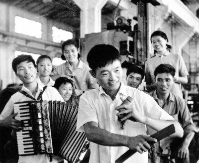 年輕的水運憲隨廠宣傳隊送節目下車間時表演自編的快板書。常德電機制造總廠,湖南德山,約1970年。圖片由受訪者提供