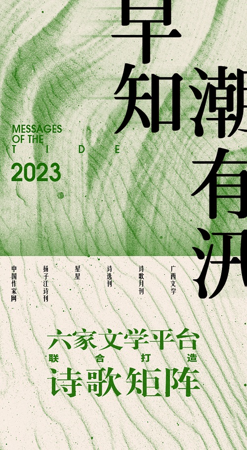 為積極響應并貫徹落實中國作協十屆二次全委會工作報告中指出的“全力培育中國文學新力量,建設規模宏大的新時代作家隊伍”要求,為新人輩出營造浪潮推舟的良好環境,推動詩歌進一步發展繁榮,《廣西文學》《詩歌月刊》《詩選刊》《星星》《揚子江詩刊》、中國作家網六家文學平臺聯合建立跨域融合發展的詩歌矩陣——“早知潮有汛”,懷著“后浪推前浪”的喜悅和責任助推文學新潮的到來。