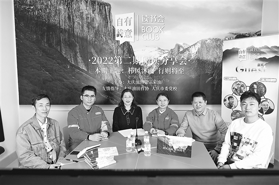 直播間設在廠機關一間小會議室,挪開幾張桌椅騰出一小塊空間,6張橘色花瓣形茶幾拼成一張“寶石花”圓桌,背景墻上寫有幾行關鍵語:“2022第二期閱讀分享會”“主題:櫛風沐雨,行則將至”“主辦:大慶油田第三采油廠”“友情指導:大慶油田作協、大慶市委黨?!?。這些使當天讀書活動的要義一目了然。