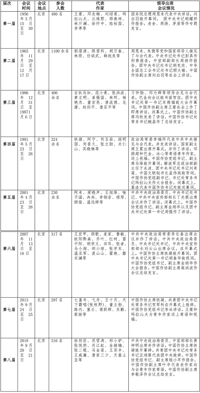 由此而后,我國的“青創會”逐漸衍成慣例,成為了青年作家成長成才的展示舞臺,也受到了黨和國家的高度重視。幾乎每次“青創會”都會有黨和國家領導人親臨會場,或與代表合影留戀,或發表重要講話,也有老作家對青年作家寄予厚望,提出希望??梢赃@樣說,“一次又一次的青創會見證了中國社會主義文學事業的繁榮發展,一代又一代的青年作家從這里汲取前行的動力”11。到目前為止,全國“青創會”一共舉辦了八屆,歷屆參會作家達3460余人(見下表)。