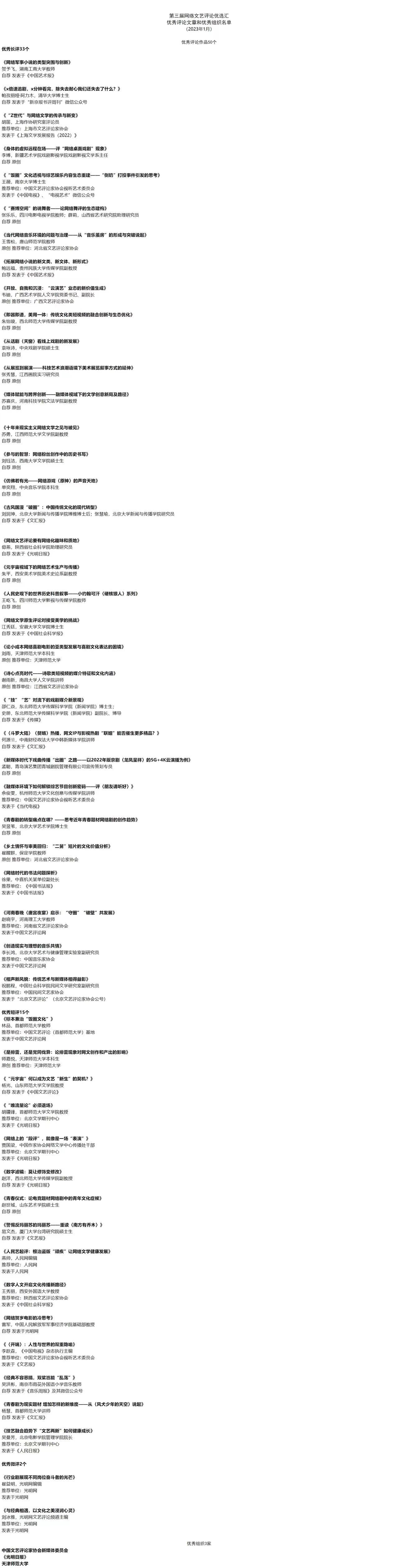 會上,第三屆網絡文藝評論優選匯同期發布成果。網絡文藝評論優選匯經中國文聯批準,每兩年舉辦一屆?;顒又荚谇袑嵷瀼刂醒腙P于加強和改進網絡文藝評論工作、加快建立網絡綜合治理體系等明確要求,有效團結凝聚壯大網絡文藝評論隊伍,推動構建良好網絡文藝生態。本屆優選匯以“中國網絡文藝這十年”為主題,吸引全國各高校、科研院所、文化機構和新文藝群體評論工作者積極參與,共有695個作品參評,其中長評335個、短評323個、微評37個。經過初評、復評、終評三輪專家匿名評審和網絡票選,并報中國文聯批準,最終推選出優秀作品50個,其中長評33個、短評15個、微評2個,同時評選出3家優秀組織。