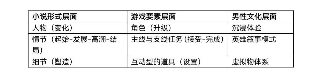 “升級、打怪、換地圖”,分別對應著故事三大形式要素——人物的變化、情節的進展和環境空間的擴展。這個游戲流程,被移植到男頻小說的敘事之中,成為男頻小說情節推進的基本模式。但是,僅僅研究二者在形式層面的移植關系是不夠的。在形式層面的移植之下,是男性文化邏輯的移植。小說形式、游戲要素、男性文化之間的對應關系如下: