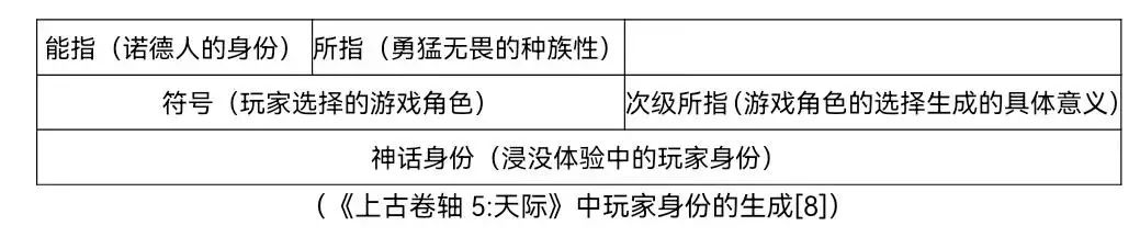 在RPG類電子游戲中,沉浸體驗的發生,來自玩家與游戲中角色的“視野疊合”和“身份疊合”?!耙曇隘B合”是技術層面的,“身份疊合”是無意識層面的。最終的結果是,玩家暫時遺忘了現實生活中自己的真實身份,獲得了游戲中的“神話身份”。我曾嘗試借助《上古卷軸5:天際》這款游戲,以羅蘭·巴特的符號分析方法,分析這個體驗的發生過程: